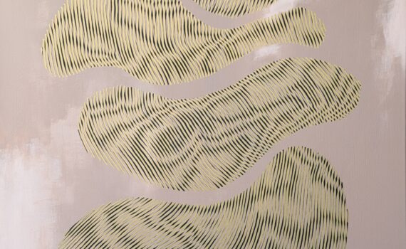 Ripplescape created while listening to ‘70s Sci-Fi soundtracks. I have named it ‘Close Encounter’, after the 1978 Sci-Fi film ‘Close Encounters of the Third Kind’, and in reference to the mysterious pattern that emerges from the intricate linework. (Acrylic paint and ink on canvas 80×120 cm).