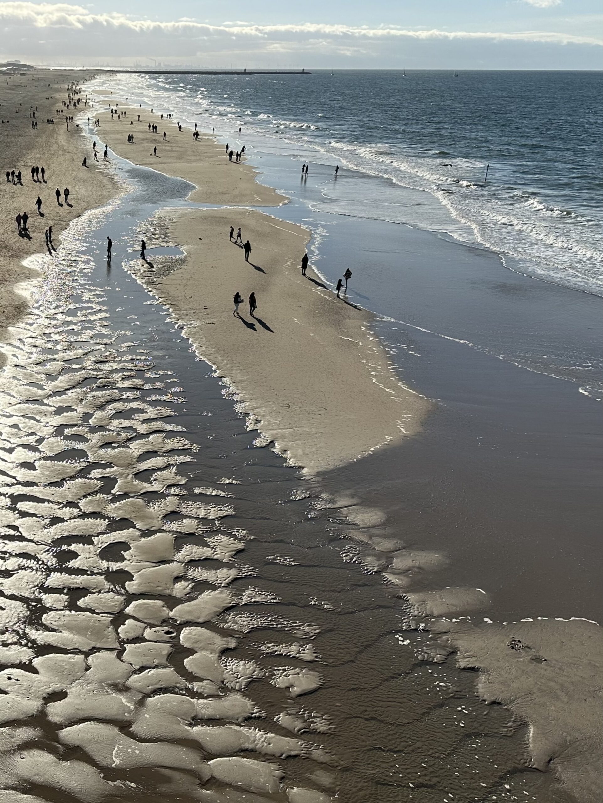 People striding the ripplescape left by the tide on the beach of Scheveningen, The Netherlands.